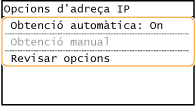 Seleccioneu <Obtenció automàtica> i establiu tant <Seleccionar protocol> com <IP automàtica> en <Desactivat>.