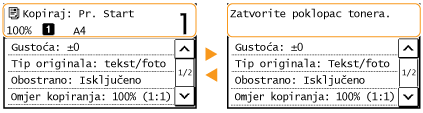 Poruke se prikazuju na zaslonu u situacijama kada ponestaje papira ili kada se dosegne kraj životnog ciklusa spremnika za toner.