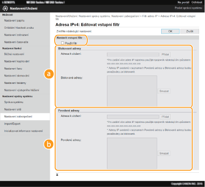 Pokud zadáte adresy IP nesprávně, může se stát, že nebude možný přístup do zařízení prostřednictvím Vzdáleného uživatelského rozhraní. V takovém případě je třeba nastavit <Filtr adres IPv4> nebo <Filtr adres IPv6> na <Vypnuto>.