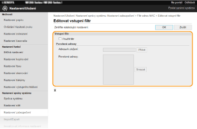Zadáte-li adresy MAC nesprávně, nebude možné se k zařízení připojit prostřednictvím Vzdáleného uživatelského rozhraní. V takovém případě je třeba nastavit <Filtr adres MAC> na <Vypnuto>. <Filtr adres MAC>