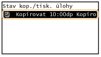 Pokud je možnost <Zobrazit výpis úloh> nastavena na <Vypnuto>, protokoly kopírování nelze kontrolovat. <Zobrazit výpis úloh>