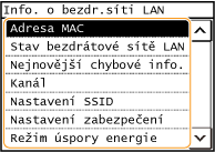 <Stav bezdrátové sítě LAN> a <Nejnovější chybové info.> lze zobrazit pomocí