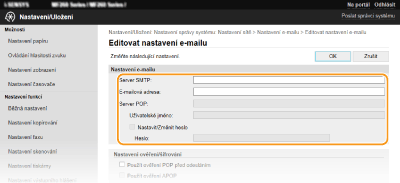 Ke konfiguraci podrobných nastavení odesílání, například nastavení ověřování POP a šifrování komunikace před odesláním e-mailu, použijte Vzdálené uživatelské rozhraní. Informace o požadovaných nastaveních získáte od poskytovatele připojení nebo správce sítě.