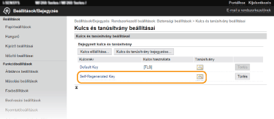 Ha a kulcsot és a tanúsítványt valamelyik funkció használja, ha például a „[TLS]” felirat látható a [Kulcs használata] mezőben, a kulcs és a tanúsítvány nem törölhető. Ebben az esetben a kulcs törlése előtt ki kell kapcsolni a funkciót, vagy le kell cserélni a kulcsot és a tanúsítványt.