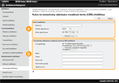 A készülék által létrehozott tanúsítványokon nincs hitelesítésszolgáltatói aláírás, ami bizonyos eszközökkel szemben kommunikációs hibához vezethet. Ahhoz, hogy a hitelesítésszolgáltató kibocsássa az aláírásával ellátott tanúsítványt, először be kell szereznie a CSR (tanúsítvány-aláírási kérés) adatait. Ezeket a rendszergazda tudja létrehozni a Távoli felhasználói felületen. Ha már kibocsátották a tanúsítványt, regisztrálja azt a kulccsal a korábban létrehozott tanúsítvány-aláírási kéréssel.