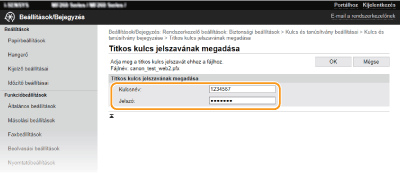 A készülékkel használni kívánt kulcs és tanúsítvány, valamint a hitelesítésszolgáltatói tanúsítvány a hitelesítésszolgáltatótól szerezhetők be. Telepítse és regisztrálja a készülékkel használni kívánt, korábban már beszerzett kulcsot és a tanúsítványfájlt, valamint a hitelesítésszolgáltatói tanúsítványfájlt a Távoli felhasználói felületet segítségével. Már előre ellenőrizze, hogy milyen feltételek megléte szükséges a készüléken a kulcs és a tanúsítvány, valamint a hitelesítésszolgáltatói tanúsítvány használatához (