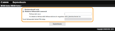 Ebben a módban jogosult ellenőrizni a dokumentumok és a készülék állapotát, valamint bizonyos beállításokhoz is hozzáfér. Ha szeretné ellenőrizni, hogy az Ön által küldött dokumentumok szerepelnek-e a nyomtatási sorban, vagy szeretné törölni az egyik dokumentumát a nyomtatási sorból, írja be a dokumentumhoz tartozó felhasználónevet a [Felhasználó neve] mezőbe. A nyomtatandó dokumentumokhoz tartozó felhasználónevet a rendszer automatikusan állítja be a számítógép neve, bejelentkezési neve vagy más hasonló adatok alapján.
