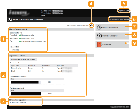 Megjeleníti a készülék aktuális állapotát és a hibainformációkat. Ha hiba történt, akkor megjelenik a Hibainformációk oldalra mutató hivatkozás.