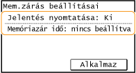 A fogadott dokumentumok memóriában történő tárolásához a <Memóriazárás beállításai> beállítást állítsa <Be> értékre. Opcionális beállítások is megadhatók, például egy időtartam beállításával megadhatja, hogy a készülék a nap melyik részében mentse memóriába a fogadott dokumentumokat.