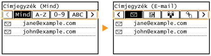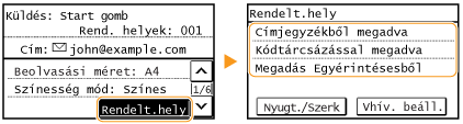 Ha ki van választva egy rendeltetési hely a <Címjegyzék> menüből a Főképernyő képernyőn, akkor az e-mail küldésére vagy a fájl mentésére vonatkozó beállítások végrehajthatók, miközben a kiválasztott rendeltetési hely marad megadva.