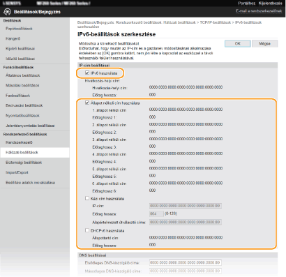 A készülék IPv6-címei a Távoli felhasználói felületen konfigurálhatók. Az IPv6-címek beállítása előtt ellenőrizze az IPv4-cím beállításait (IPv4-beállítások megtekintése). Az IPv6-címek használatához szükség van az IPv4-beállítások helyes megadására. A lapolvasó-illesztőprogramot vagy MF Scan Utility programot használó beolvasási funkció nem érhető el IPv6-környezetben. A készülék több IPv6-címet használhat, még pedig a következőket: