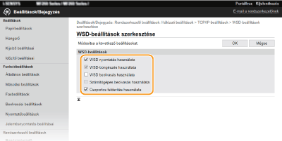 WSD-n keresztüli nyomtatáshoz jelölje be ezt a jelölőnégyzetet. Ha nem használ WSD-nyomtatást, akkor törölje a jelet a jelölőnégyzetből. [WSD-böngészés használata]