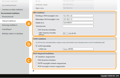 A Bonjour által meghonosított mDNS (multicast DNS) olyan protokoll, amely a DNS használata nélkül társítja egymáshoz az állomásnevet és az IP-címet. Az mDNS engedélyezéséhez jelölje be a jelölőnégyzetet, majd adja meg az mDNS-nevet az [mDNS-név] szöveges mezőben. [DHCP kiegészítő beállításai][Gazdanév megszerzése]