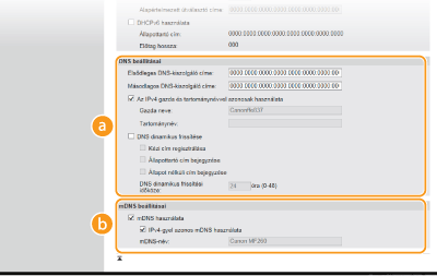 A Bonjour által meghonosított mDNS (multicast DNS) olyan protokoll, amely a DNS használata nélkül társítja egymáshoz az állomásnevet és az IP-címet. Jelölje be a jelölőnégyzetet az mDNS funkció engedélyezéséhez. [IPv4-gyel azonos mDNS használata]