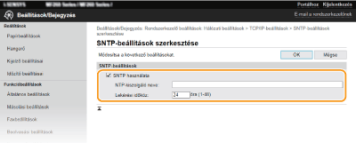 Jelölje be a [SNTP használata] jelölőnégyzetet, és adja meg a szükséges beállításokat.