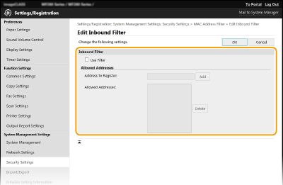 Jei MAC adresai bus įvesti neteisingai, gali būti, kad negalėsite pasiekti aparato naudodami priemonę „Remote UI“ (Nuotolinio vartotojo sąsaja). Tokiu atveju parinktį <MAC adreso filtras> turėsite nustatyti kaip <Išjungta>. <MAC adreso filtras>
