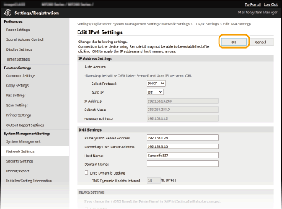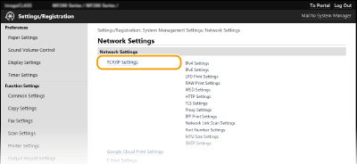 Portalo puslapyje spustelėkite [Settings/Registration]. Priemonės „Remote UI“ (Nuotolinio vartotojo sąsaja) ekranas