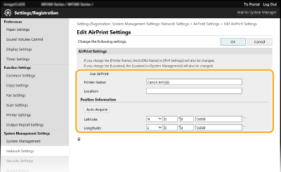 Galite įjungti / išjungti „AirPrint“ esančią nuskaitymo funkciją. Numatytasis parametras yra <Įjungta>.
