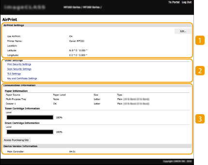 Galite nurodyti, ar šifruoti ryšį naudojant TLS spausdinant arba siunčiant faksu per „AirPrint“. Numatytasis gamyklos parametras yra [On].