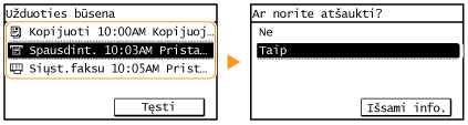 Atšaukimas naudojant „Remote UI“ (Nuotolinio vartotojo sąsaja).Spausdinimą galite atšaukti iš „Remote UI“ (Nuotolinio vartotojo sąsaja) puslapio [Job Status]: Spausdinamų dokumentų esamos būsenos tikrinimas