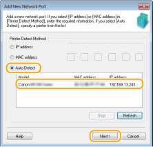 Spustelėkite [Atnaujinti]. Jei problema išlieka, pasirinkite [IP adresas] arba [MAC adresas], įveskite aparato IP arba MAC adresą (Tinklo parametrų peržiūra), tada spustelėkite [Pirmyn].