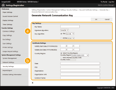 زمانی که برای ارتباط رمزگذاری شده از طریق امنیت لایه انتقال (TLS) لازم است می توانید یک کلید و گواهی برای دستگاه ایجاد کنید. زمان دسترسی به دستگاه از طریق Remote UI (واسط کاربر از راه دور) می توانید از TLS استفاده کنید. گواهی های خود امضا با کلید و گواهی ایجاد شده در "ارتباط شبکه" استفاده می شوند.