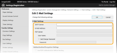 از Remote UI (واسطه کاربر از راه دور) برای پیکربندی تنظیمات دقیق ارسال مانند تنظیمات تأیید اعتبار POP و رمزگذاری ارتباط قبل از ارسال ایمیل استفاده کنید. برای تنظیمات مورد نیاز با ارائه دهنده یا مدیر شبکه تماس بگیرید.