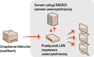 Dane uwierzytelniające są wysyłane do serwera RADIUS i przez niego weryfikowane. W rezultacie serwer wyraża zgodę na komunikacje z siecią albo odrzuca prośbę połączenia w zależności od wyniku procesu uwierzytelniania. Jeśli uwierzytelnianie zostanie zakończone niepowodzeniem, przełącznik sieci LAN (lub punkt dostępowy) blokuje dostęp spoza sieci. Urządzenie można podłączyć do sieci 802.1X jako urządzenie klienckie.