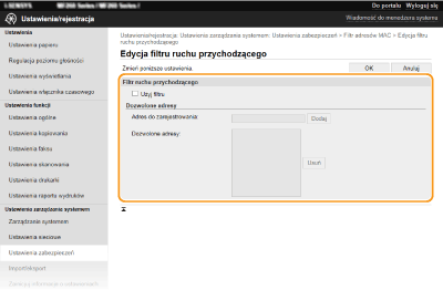 Nieprawidłowo wprowadzone adresy MAC mogą uniemożliwić dostęp do urządzenia z poziomu Zdalnego interfejsu użytkownika. Konieczne będzie wtedy ustawienie filtra <Filtr adresów MAC> na wartość <Wyłącz>. <Filtr adresów MAC>