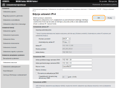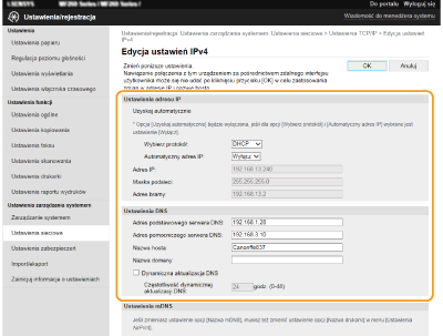 Za pomocą Zdalnego interfejsu użytkownika można zmieniać różne ustawienia urządzenia. Większość ustawień można konfigurować także w urządzeniu, ale niektóre z nich mogą zostać zmienione tylko za pomocą Zdalnego interfejsu użytkownika. W tej części opisano podstawowy przebieg procedury modyfikacji ustawień urządzenia przy użyciu Zdalnego interfejsu użytkownika.