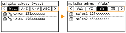 Często używane miejsca docelowe faksowania/skanowania można zarejestrować w książce adresowej, co ułatwia ich wybieranie (Zapisywanie odbiorców w książce adresowej). Odbiorców można wyszukiwać alfabetycznie z list w książce adresowej lub poprzez wprowadzenie trzycyfrowego numeru (numeru wybierania kodowego). Określanie odbiorców można przyspieszyć, używając następujących opcji.