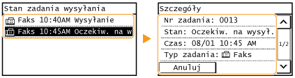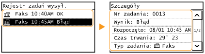 Gdy dla opcji <Wyświetlanie rejestru zadań> wybrano ustawienie <Wyłącz>, dzienniki przesyłania danych są niedostępne. <Wyświetlanie rejestru zadań>