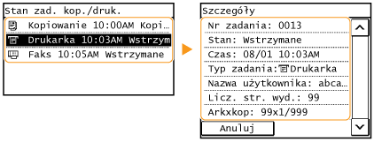Gdy dla opcji <Wyświetlanie rejestru zadań> wybrano ustawienie <Wyłącz>, dzienniki wydruków są niedostępne. <Wyświetlanie rejestru zadań>