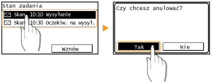 Oryginały zostały zeskanowane i oczekują na przetworzenie. Wybierz dokument, który chcesz anulować, a następnie wybierz <Tak>.