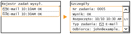 Gdy dla opcji <Wyświetlanie rejestru zadań> wybrano ustawienie <Wyłącz>, dzienniki wysłanych dokumentów są niedostępne. <Wyświetlanie rejestru zadań>