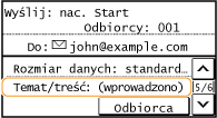 Podczas załączania zeskanowanych oryginałów do wiadomości e-mail można określić temat, treść wiadomości, adres zwrotny oraz priorytet wiadomości e-mail przed jej wysłaniem.