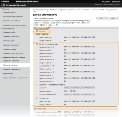 Adresy IPv6 urządzenia można skonfigurować za pomocą Zdalnego interfejsu użytkownika. Przed rozpoczęciem konfiguracji adresów IPv6 należy sprawdzić ustawienia adresu IPv4 (Wyświetlanie ustawień IPv4). Aby korzystać z adresów IPv6, należy poprawnie skonfigurować ustawienia adresu IPv4. Funkcja skanowania używająca sterownika skanera lub narzędzia MF Scan Utility jest niedostępna w środowisku IPv6. Urządzenie może korzystać z następujących wielu adresów IPv6: