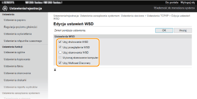 Zaznaczenie tego pola wyboru umożliwia uzyskanie informacji o urządzeniu przez komputer za pomocą interfejsu WSD. To pole wyboru jest zaznaczane automatycznie po zaznaczeniu pola wyboru [Użyj drukowania WSD]. [Użyj skanowania WSD]