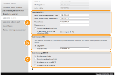 Wprowadzony w programie Bonjour protokół mDNS (system DNS w trybie multiemisji) kojarzy nazwę hosta z adresem IP bez korzystania z usługi DNS. Aby włączyć protokół mDNS, należy zaznaczyć odpowiednie pole wyboru i wprowadzić nazwę mDNS w polu tekstowym [Nazwa mDNS]. [Ustawienia opcji DHCP][Uzyskaj nazwę hosta]