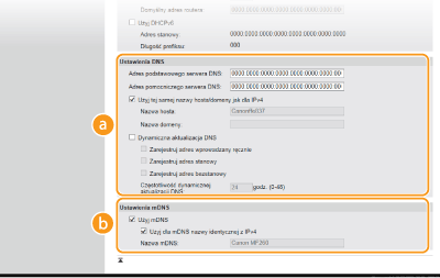 To pole wyboru należy zaznaczyć, aby rekordy DNS były dynamicznie aktualizowane po każdej zmianie adresu IP urządzenia. Czas odstępów między aktualizacjami można określić, wprowadzając czas w godzinach w polu tekstowym [Częstotliwość dynamicznej aktualizacji DNS]. [Ustawienia mDNS][Użyj mDNS]