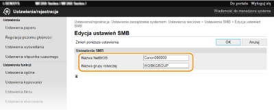 Blok komunikatów serwera (SMB) to protokół umożliwiający udostępnianie zasobów, takich jak pliki i drukarki, kilku urządzeniom w sieci. Urządzenie używa protokołu SMB do przechowywania zeskanowanych dokumentów w folderze udostępnionym. W zależności od sieci konieczne może być określenie nazwy NetBIOS i nazwy grupy roboczej.