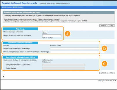 Za pomocą programu Narzędzie konfiguracji funkcji wysyłania można zarejestrować folder udostępniony, w którym zapisywane będą zeskanowane dokumenty w menu <Jednoprzyciskowe> książki adresowej. Należy wybrać numer z listy rozwijanej.
