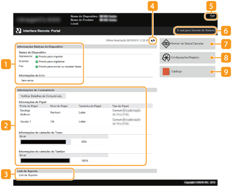 Quando inicia sessão na UI Remota, aparece a seguinte página do portal. Esta secção descreve os itens apresentados na página do portal e as operações básicas.