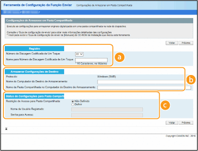 Clique no botão de opção [Não Definido] ou [Definir] para fazer corresponder a definição às restrições de acesso definidas para a pasta partilhada. Se selecionar [Definir], introduza o nome de utilizador na caixa de texto [Nome de Usuário Registrado] e a palavra-passe na caixa de texto [Senha para Acesso].