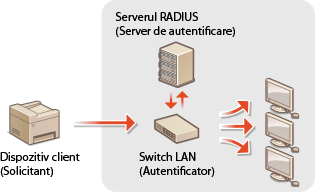 Aparatul se poate conecta la o reţea 802.1X ca un dispozitiv client. O reţea normală 802.1X conţine un server RADIUS (server de autentificare), un switch LAN (autentificator) şi dispozitivele client cu software de autentificare (solicitanţi). Dacă un dispozitiv încearcă să se conecteze la reţeaua 802.1X, dispozitivul trebuie să treacă prin autentificarea utilizatorului pentru a demonstra că acea conexiune este realizată de un utilizator autorizat. Informaţiile de autentificare sunt trimise către şi verificate de un server RADIUS, care permite sau respinge comunicarea cu reţeaua în funcţie de rezultatele autentificării. Dacă autentificarea eşuează, un switch LAN (sau un punct de acces) blochează accesul din exterior la reţea.