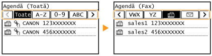 Puteţi înregistra destinaţii de fax/scanare utilizate frecvent în Agendă şi le puteţi selecta uşor când aveţi nevoie de ele (Înregistrarea destinaţiilor în Agendă). Destinaţiile pot fi căutate în ordine alfabetică, din liste din Agendă sau introducând numere de trei cifre (număr apelare codificată). Puteţi specifica destinaţii şi mai repede folosind următoarea funcţie.