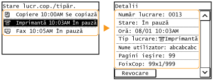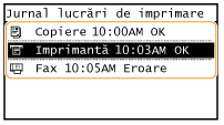Selectaţi <Jurnal lucrări de imprimare> şi selectaţi documentul pentru care doriţi să verificaţi jurnalul.