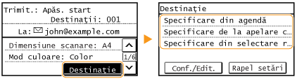 Dacă se selectează o destinaţie de la oricare dintre <Sel. rap. 1> la <Sel. rap. 4> în ecranul Pornire, se pot efectua setări pentru trimiterea e-mailurilor sau pentru salvarea fişierelor în timp ce destinaţia selectată rămâne specificată.