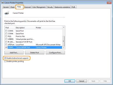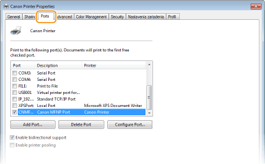 Ak používate sieťové pripojenie a zmenili ste adresu IP zariadeniaAk je položka [Popis] pre vybratý port [Port Canon MFNP] a zariadenie a počítač sú v rovnakej podsieti, pripojenie sa uchová. Nemusíte pridať nový port. V prípade možnosti [Štandardný port TCP/IP] musíte pridať nový port. Konfigurácia tlačových portov