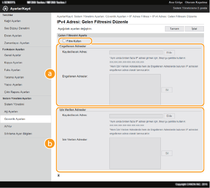 IP adresleri yanlış girildiyse Uzak Kullanıcı Arabirimi'nden makineye erişemeyebilirsiniz ve bu durumda <IPv4 Adres Filtresi> veya <IPv6 Adres Filtresi> öğesini <Kapalı> durumuna getirmeniz gerekir. <IPv4 Adres Filtresi><IPv6 Adres Filtresi>